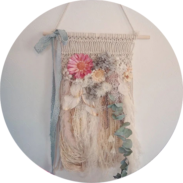 相性抜群のマクラメとドライフラワー、ただ飾るだけでもお部屋の雰囲気をグッとオシャレにしてくれるタペストリーです。